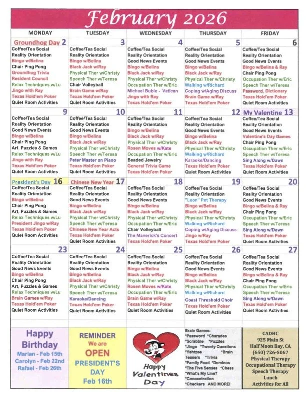 February 2026 Feb 6 Written By CADHC Please call 650-726-5067 if you have any questions about the Activities Calendar/ Meals for the month! CADHC